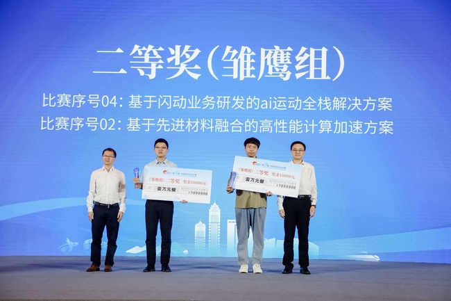 致公黨中央聯絡部副部長、留學人員委員會秘書長周慧(圖左),蘇州市人民政府副秘書長吳旭翔(圖右)為獲得“雛鷹組”一等獎的項目團隊代表頒獎