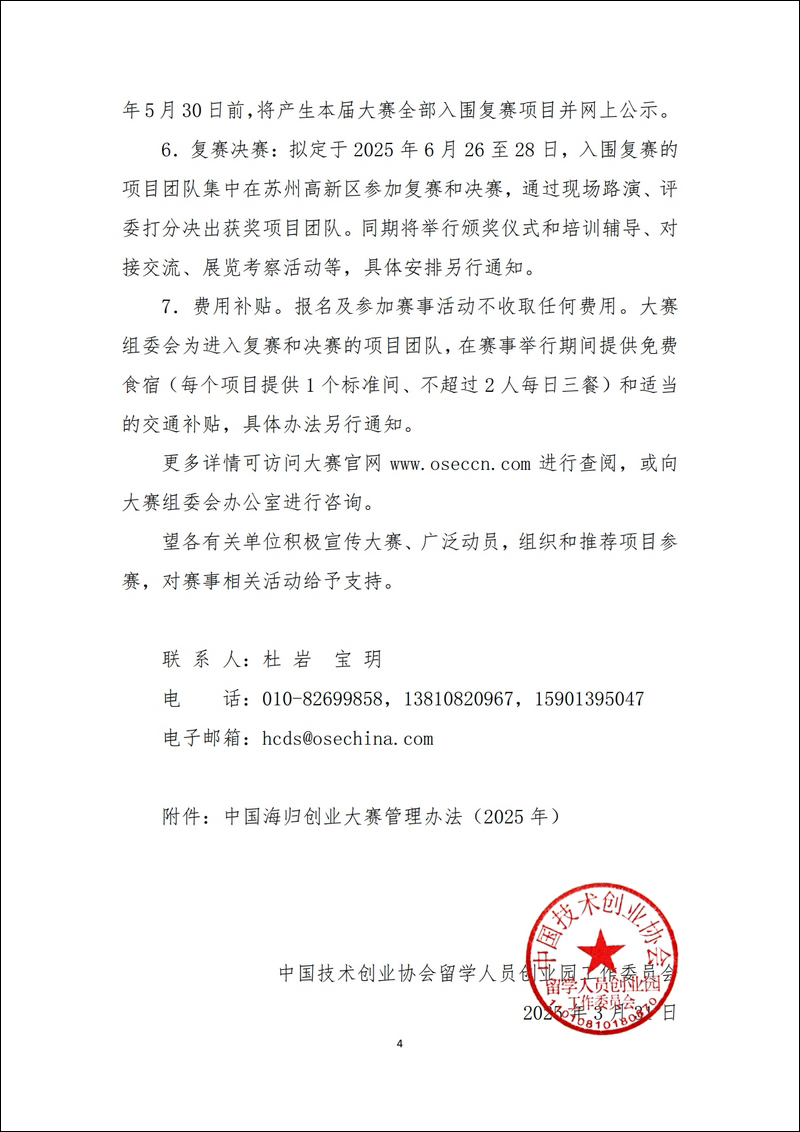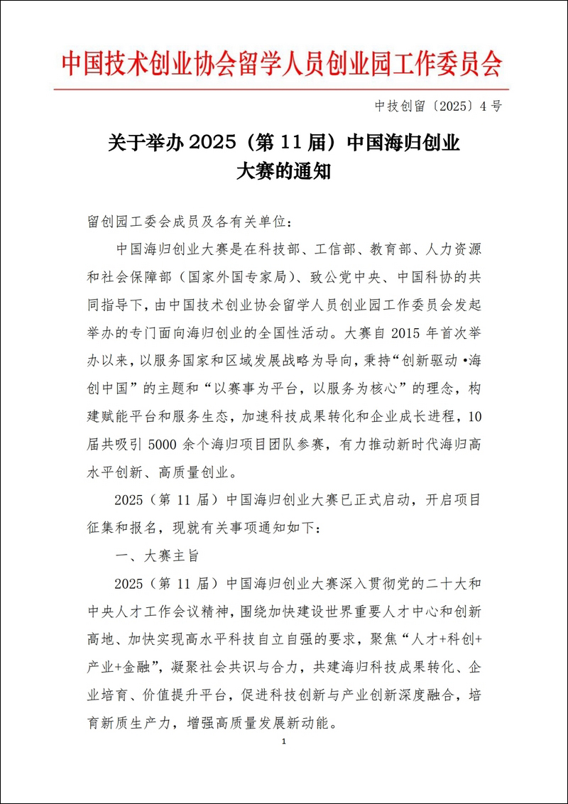 發(fā)文時(shí)間:2025-03-31 發(fā)文單位:中國(guó)技術(shù)創(chuàng)業(yè)協(xié)會(huì)留學(xué)人員創(chuàng)業(yè)園工作委員會(huì) 中技創(chuàng)留〔2025〕4號(hào)